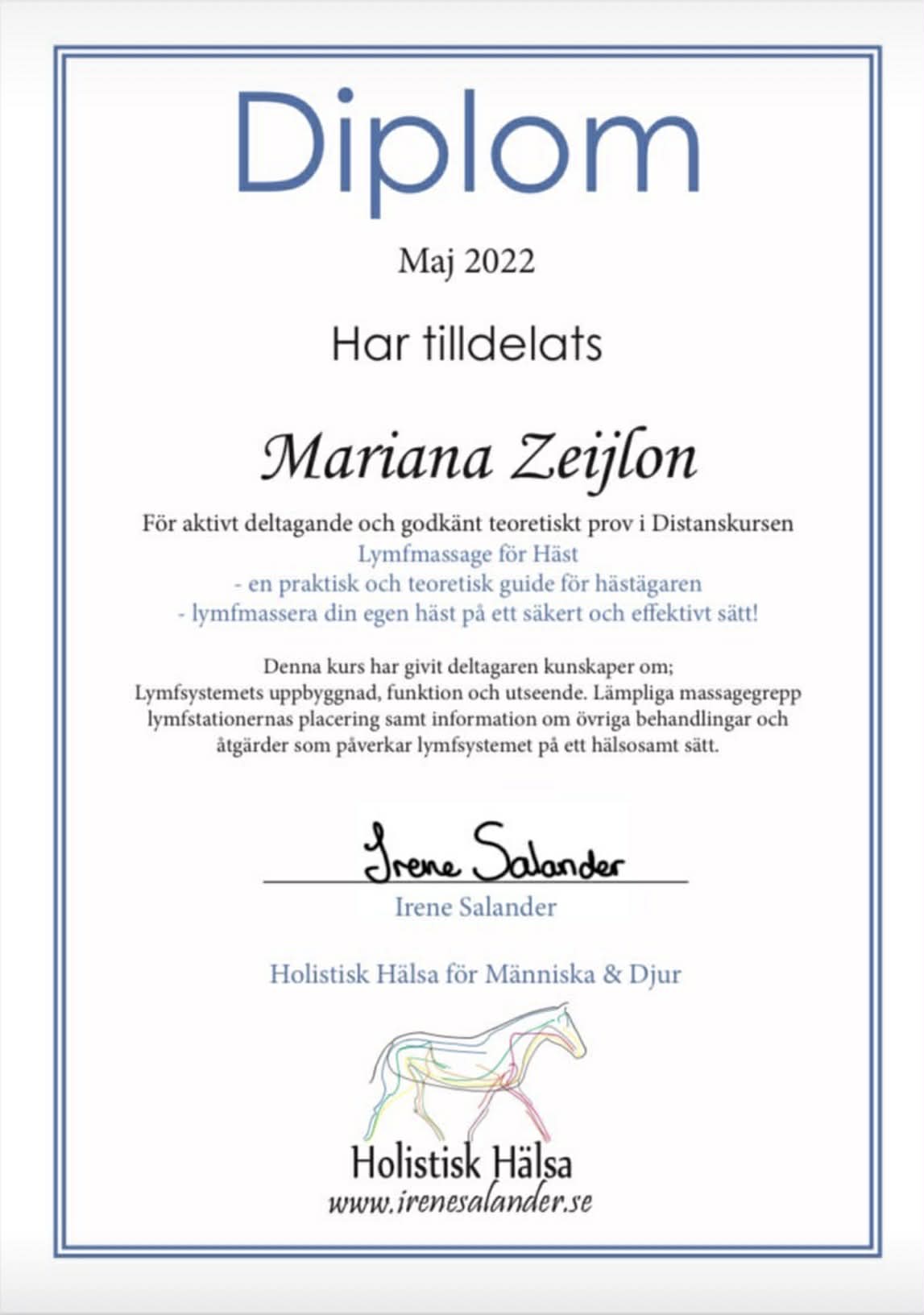 Jag heter Mariana Zeijlon och driver MZ HorseCare. Jag bor på en gård utanför Eskilstuna i Ärla tillsammans med min sambo, våra två barn och våra djur – hästar har varit en självklar del av mitt liv sedan jag lärde mig gå. Större delen av mitt vuxna liv har jag arbetat med hästar, bland annat i travstall där jag både körde och ridtränade starthästar, samt i tillridnings- och försäljningsstall. Jag har även haft egna hästar på tillridning och omskolning, främst travhästar som fått nya uppgifter som ridhästar.
